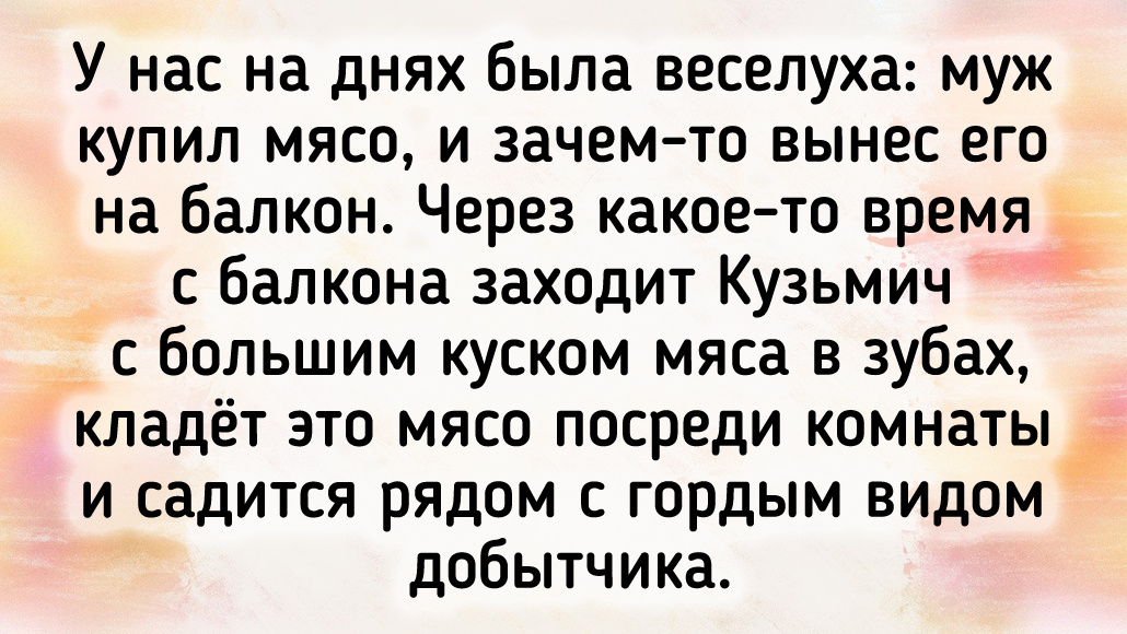 У нас на днях была веселуха: муж купил мясо, и зачем-то вынес его на балкон. Через какое-то время с балкона заходит Кузьмич с большим куском мяса в зубах, кладёт это мясо посреди комнаты и садится рядом с гордым видом добытчика. © Елизавета Мочалкина / ADME
