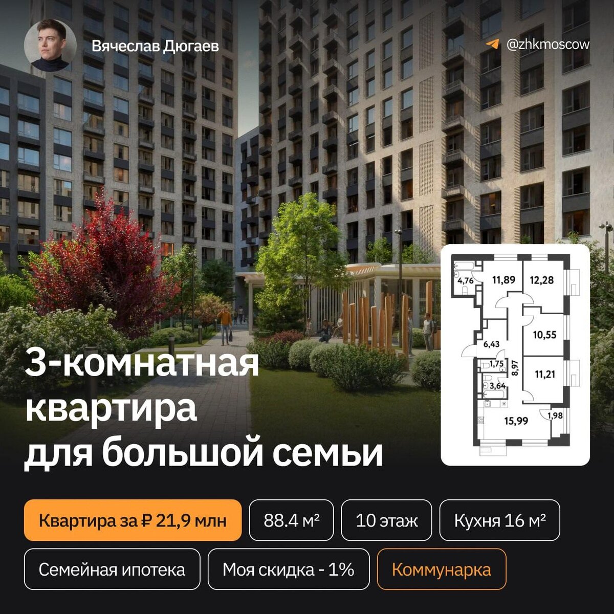 Идеальная квартира для семьи или инвестиций 3-комнатная квартира 88,4 м² • Двусторонний вид на улицу и двор • Уютный ЖК в экологически чистом районе • 10 этаж ✅Доступна семейная ипотека от Сбербанка с 24% скидкой Итоговая цена: 21 150 806 ₽ ПВ 43%: 9 150 806 ₽ Ежмесячный платеж: 72 000 ₽ ⭐Также доступна рассрочка с ПВ 10% Местонахождение 📍Новая Москва Переходите сюда и получите свою персональную подборку лучших предложений
