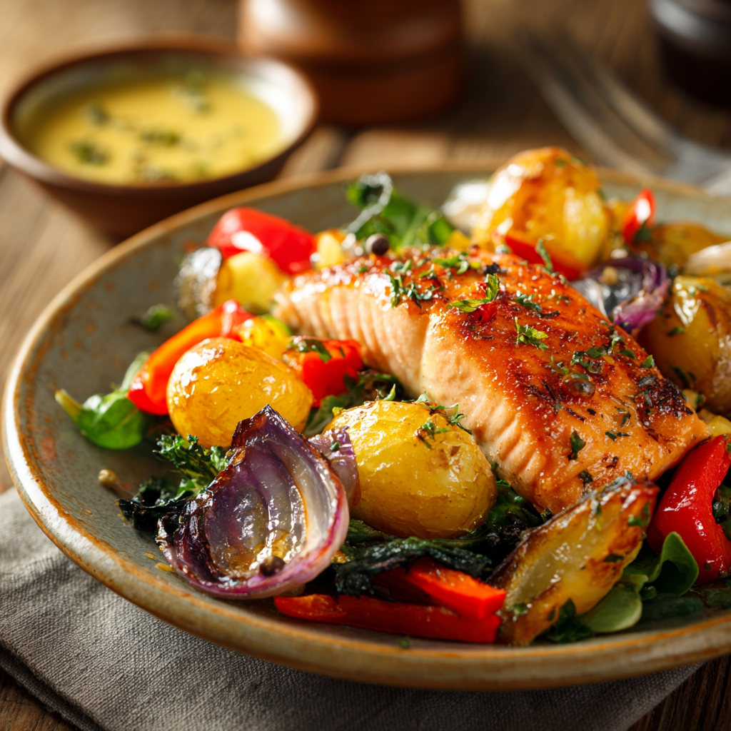 Сочный лосось, тёплый картофель и яркие овощи — ужин, который готовится легко, но выглядит как ресторанное блюдо. 🛒 Ингредиенты (на 2 порции): * Филе лосося — 300–350 г * Молодой картофель в кожуре — 4 шт., разрезать пополам * Болгарский перец — 1 шт., крупными дольками * Красный лук — ½ шт., крупными дольками * Оливковое масло — 2 ст. л. * Дижонская горчица — 1 ч. л. * Мёд — ½ ч. л. * Лимонный сок — 1 ч. л. * Соль, перец — по вкусу * Свежая зелень — для подачи 👩🍳 Приготовление: 1. Разогрейте духовку до 200°C. Картофель разрежьте пополам, перец и лук крупно нарежьте, сбрызните оливковым маслом, посолите. Запекайте 20–25 минут до золотистой корочки и мягкости. 2. Филе лосося слегка посолите. Обжарьте на сухой сковороде 4–5 минут с каждой стороны до золотистой корочки. 3. Смешайте оливковое масло, дижонскую горчицу, мёд и лимонный сок — получится лёгкая пикантная заправка. 4. На тарелку выложите картофель и овощи, сверху аккуратно разместите лосось. Полейте заправкой и украсьте зелен