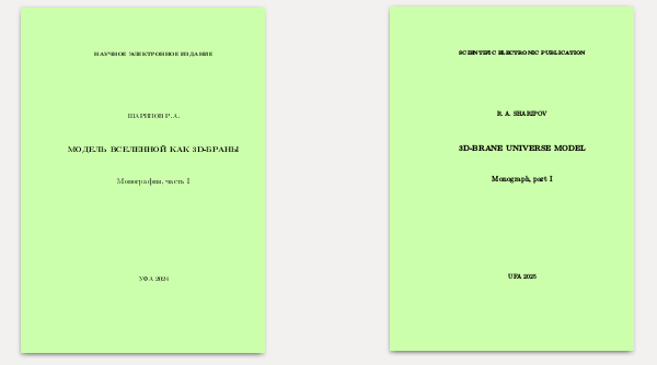 Руслан Шарипов. 1 ... 17 18 19 ... en Первый период разработки теории «Модель вселенной как 3D-браны» начался летом 2022 года и завершился в конце лета 2023 года. Книга с одноимённым названием на русском языке была издана летом 2024 года. Весной 2025 года был издан её перевод на английский язык. Книгу на русском языке можно скачать здесь: Shr10brus.pdf. Книга на английском языке доступна здесь: Shr10beng.pdf. Почему я выбрал слово разработка, а не исследование. В случае исследования обычно имеется объект исследования. Исследователь воздействует на него всеми доступными ему способами и изучает результаты своих воздействий. В случае разработки теории имеется некоторый посыл, исходя из которого разработчик строит элементы своей теории. Таким посылом для меня стало убеждение о нефизичности соединения пространства и времени в одном континууме. Пространство вселенной и материя в ней всё-таки трёхмерны. Именно такими мы их воспринимаем и чувства нас в этом не обманывают. В процессе разработк