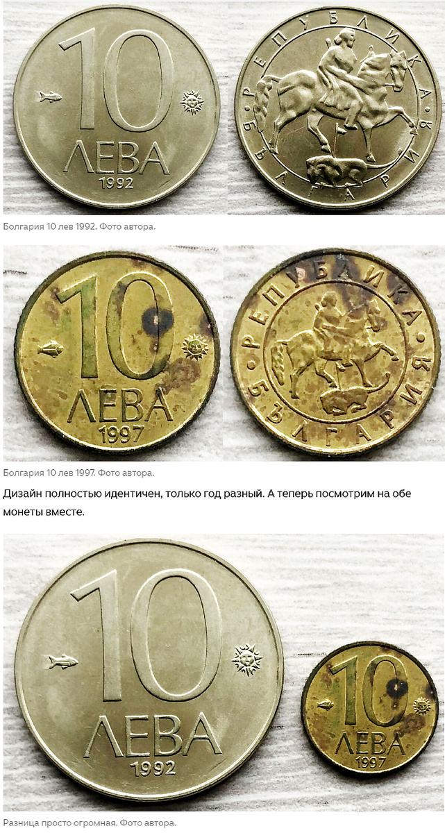 В 1989 году начался распад советского лагеря. В период 1989-1990 Болгария так же сбросила социалистическое прошлое. И превратилась из «Народной Республики Болгария» в «Республику Болгария». Первые монеты обновленной республики появились в 1992 году. Несколько лет спустя вышла другая серия. Неискушенные коллекционеры складывали обе серии в одну «кучку», полагая, что это единый выпуск. Но это не так. Мы уже сталкивались с подобными ситуациями. Сравните итальянские 100 лир 1981 и 1992. А на отдельных фотографиях они выглядят одинаковыми. Или, например, турецкие 100 лир 1987 и 1988. Один год плюсом и разница очень большая. Здесь у нас схожий случай: это же просто Давид и Голиаф! Обновлённую статью о монетах Болгарии читайте здесь --- https://dzen.ru/a/Y_MpgEgC7HADXR6W