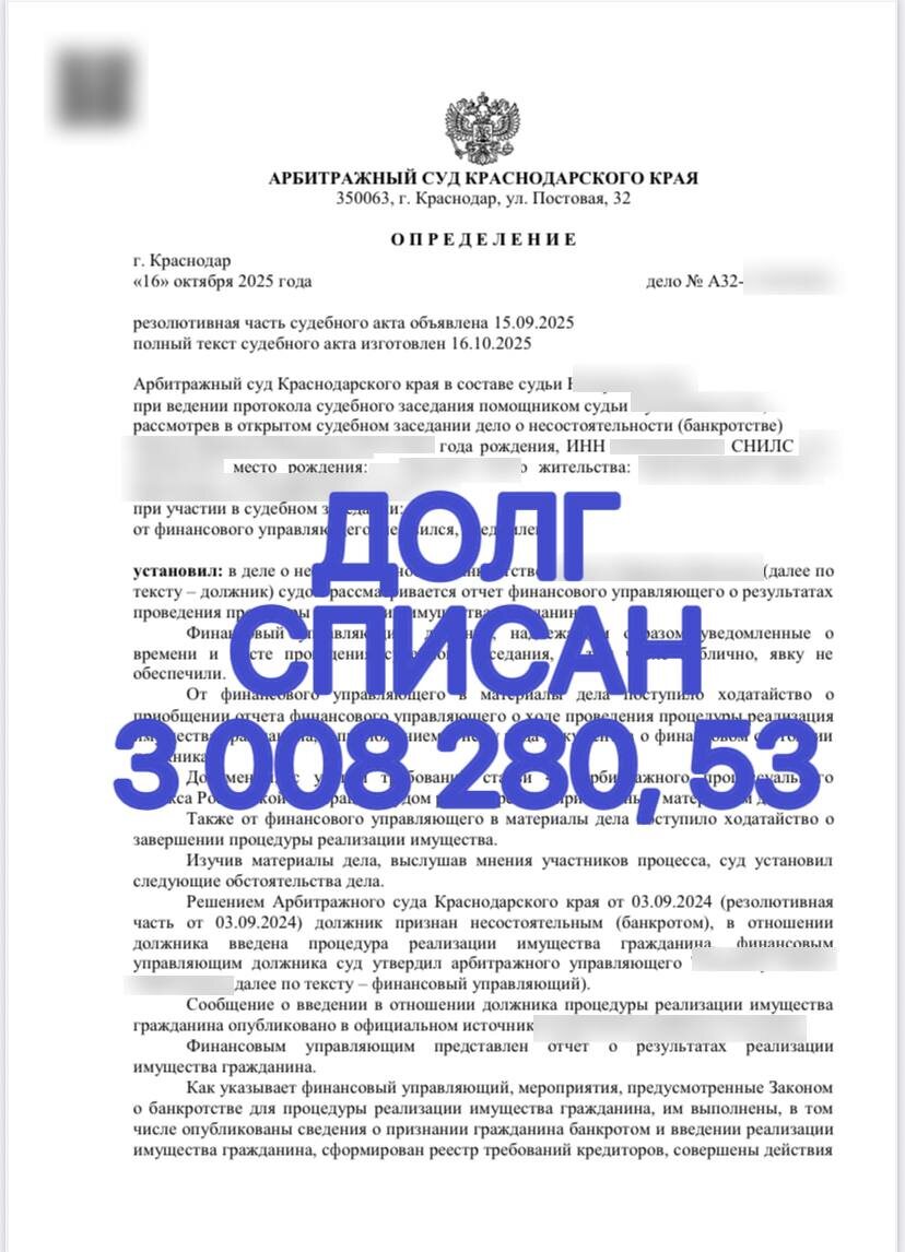🧋Минутка радости!☕️ 🌿Юрьевна Марина обратилась к нам с вопросом списания Долгов и кредитов в прошлом году.💫 💸У Марины Юрьевны накопился долг 3 008 280,53, после достижения пенсионного возраста она лишилась работы и она уже не могла погасить денежные обязательства. 🏦 🫠Попытки трудоустройства не увенчались успехом, долги росли, коллекторы начали терроризировать Марину Юрьевну и ее родственников, и она обратилась к нам за помощью.☘️ 👩⚖️В суде мы отстояли позицию необходимости освободить Марину от исполнения обязательств перед кредиторами⚖️ ⚡️И вот сегодня — радостная новость: долги списаны! 🏆Команда поздравляю нас с этой победой! 🫰Марина Юрьевна благодарна каждому кто принимал участие в ее деле!