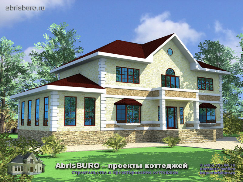 Готовый проект двухэтажного дома К318-377 с цокольным этажом, эркером, балконом и крытой, застекленной террасой общей площадью 377 квадратных метров в архитектурном бюро AbrisBURO.