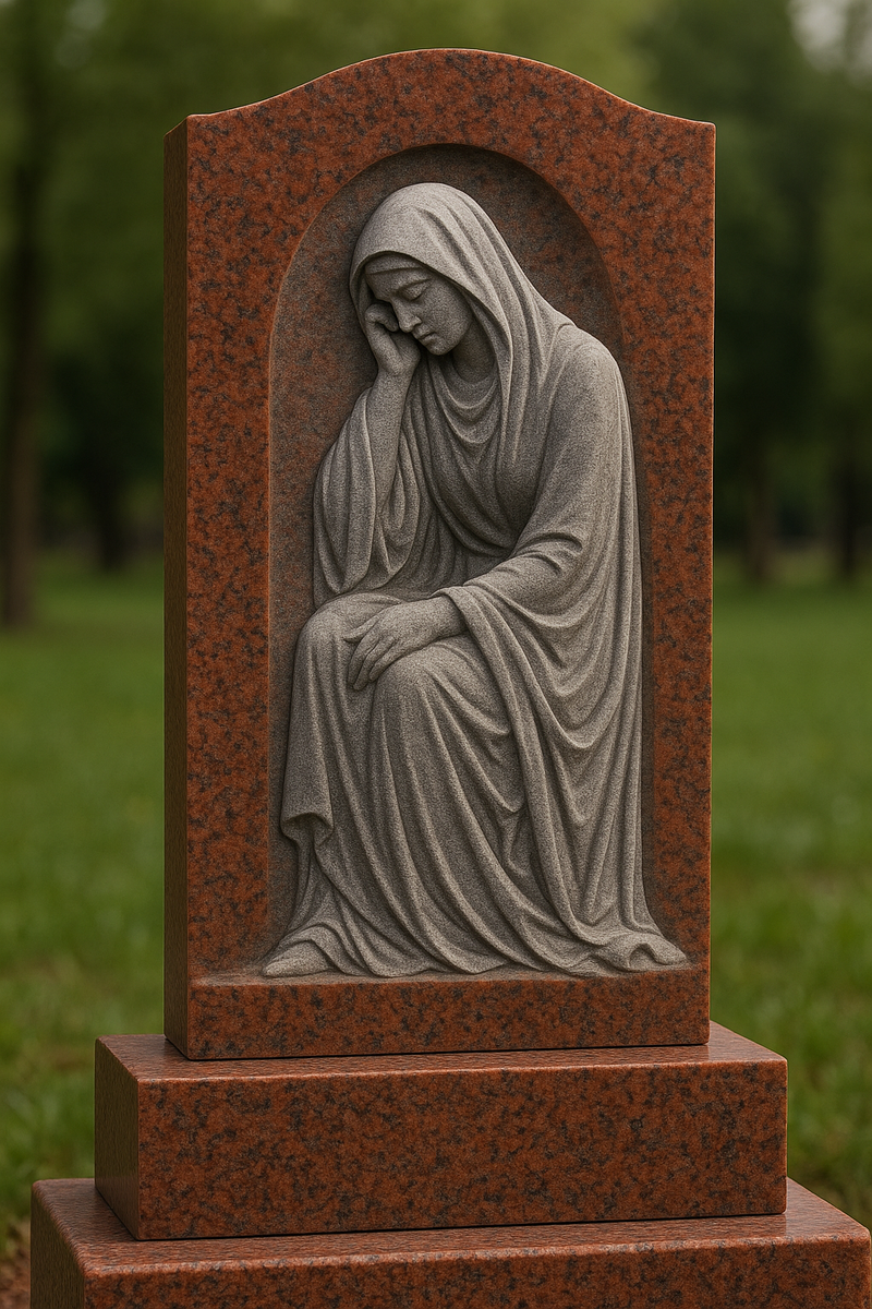 Гранитная скульптура скорбящей женщины в плаще: воплощение вечной памяти и скорби на надгробии