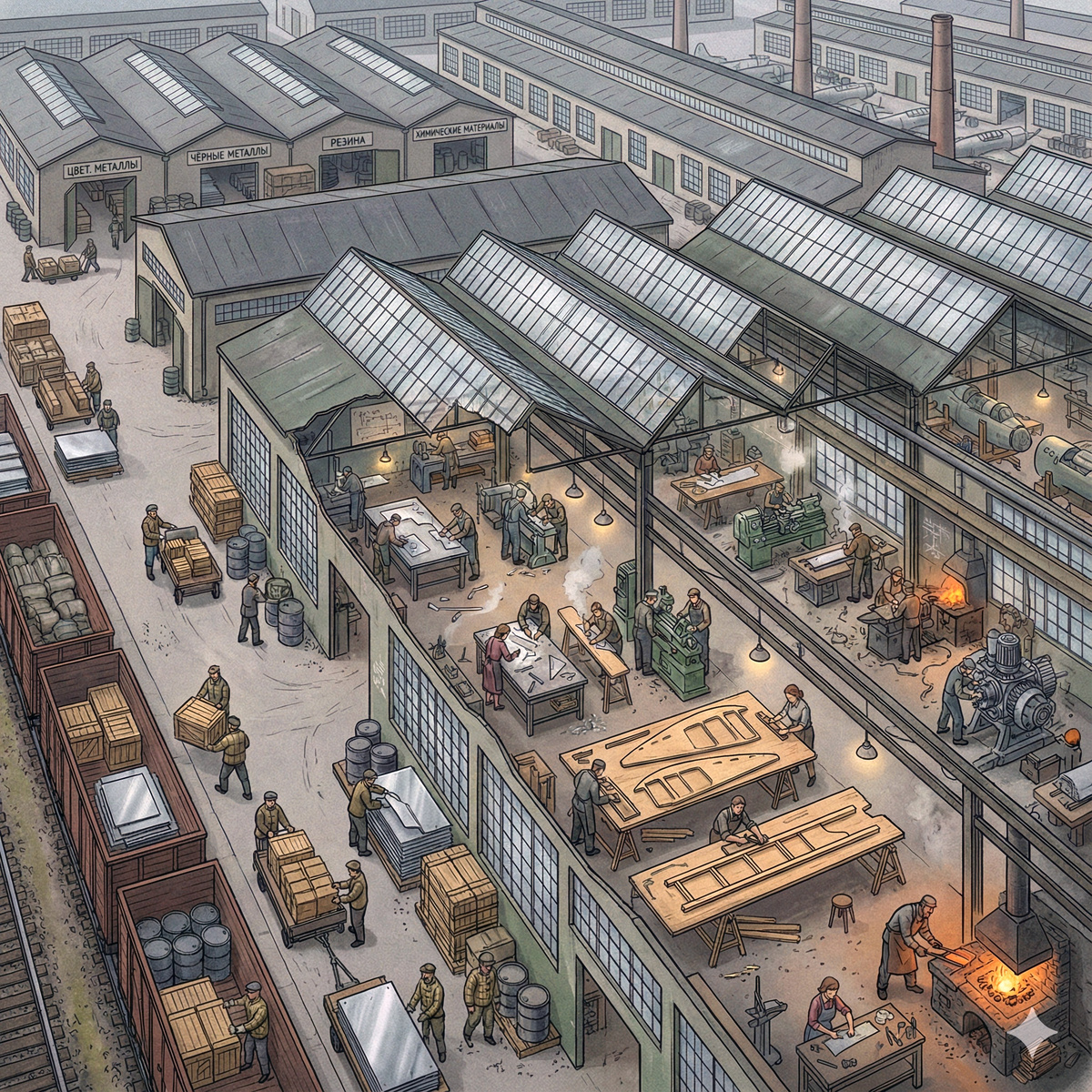 Боевой самолёт — сгусток современной науки и техники. Его сложность особенно видна без обшивки, когда раскрывается хитросплетение трубок, проводов, приборов и механизмов. Истребитель того времени весил около 3–4 тонн, поэтому завод перерабатывал колоссальные объёмы материалов. Их подавали прямо с железнодорожной ветки в специализированные склады: алюминий и сплавы — в склад цветных металлов, сталь и чугун — в склад чёрных, резиновые изделия — в склад резины, краски и лаки — в склад химических изделий. Рядом работали заготовительные цехи, где по шаблонам раскраивали металл, строгали древесину, резали фанеру для обшивки крыла и фюзеляжа, готовили болванки для кузницы и раскраивали полотно для обтяжки рулей и элеронов.