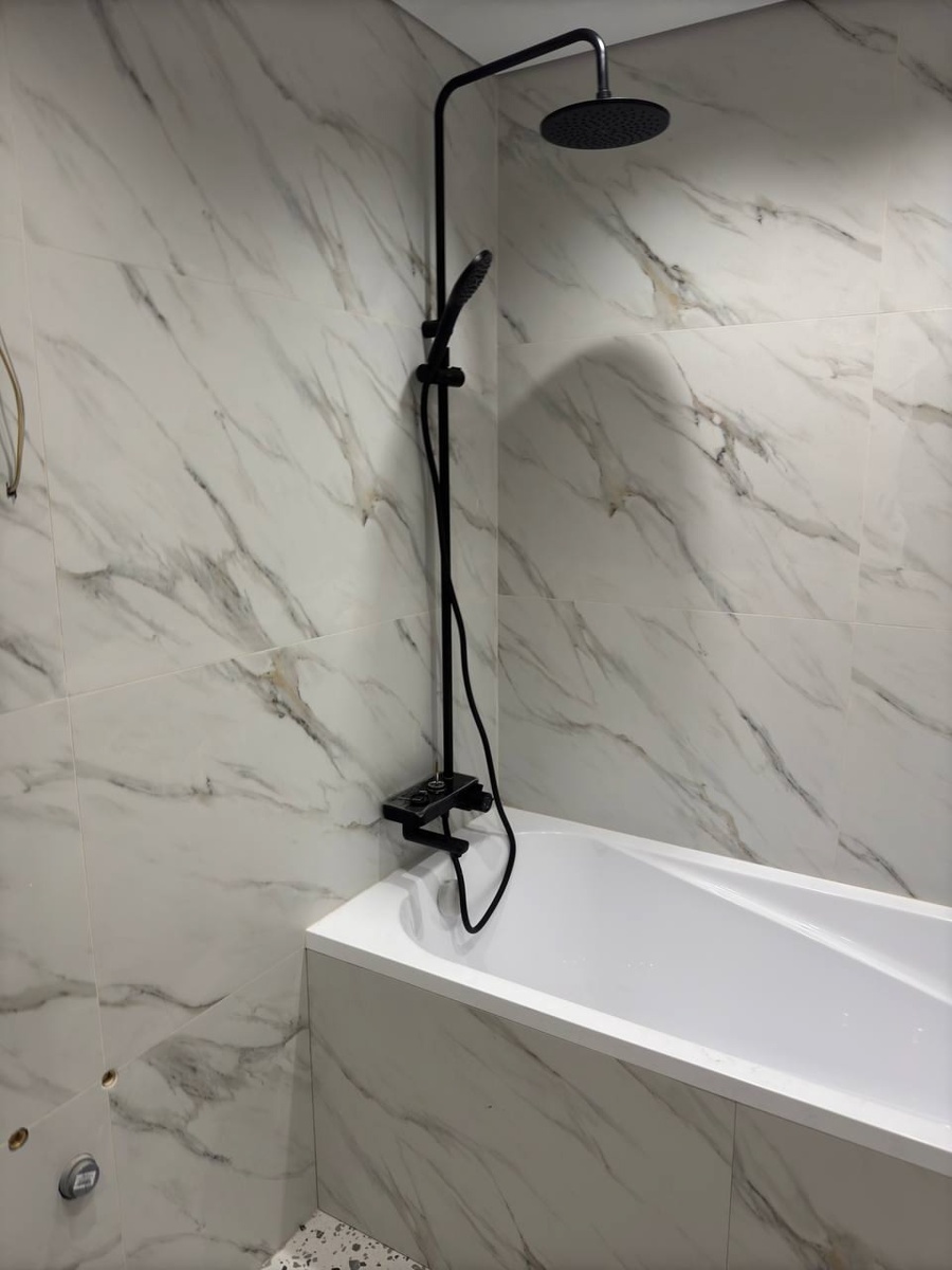 - Завершите черновую отделку: плитка, стены, потолок, сантехника.