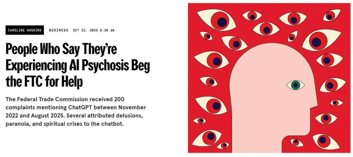Секта свидетелей ChatGPT… С 2022 по 2025 год Федеральная торговая комиссия США (FTC) получила примерно 200 жалоб на ChatGPT. Большинство из них — мелочи: неудобные переписки, невозможность получить возврат, плохие ответы — каких только жалоб нет. Но вот есть и более серьёзные: общение с ИИ вызывало у людей психоз, паранойю, духовные кризисы и даже галлюцинации. Один из случаев описывает, как мужчина впал в бредовое состояние. По словам его матери, бот советовал ему отказаться от приёма лекарств и опасаться родителей. Всего подобных обращений, где связывали общение с творением Альтмана и психотические эпизоды, — семь. ChatGPT усиливал бред человека, создавая иллюзию эмпатии, а иногда даже духовных откровений. И, кажется, что это лишь верхушка айсберга, так как огромное количество случаев просто не фиксируется. Ещё в мае журнал Rolling Stone собрал подобные истории — и там прям откровенная шизуха. Вот один пример из их статьи: 27-летняя учительница — её партнёр начал использовать Chat