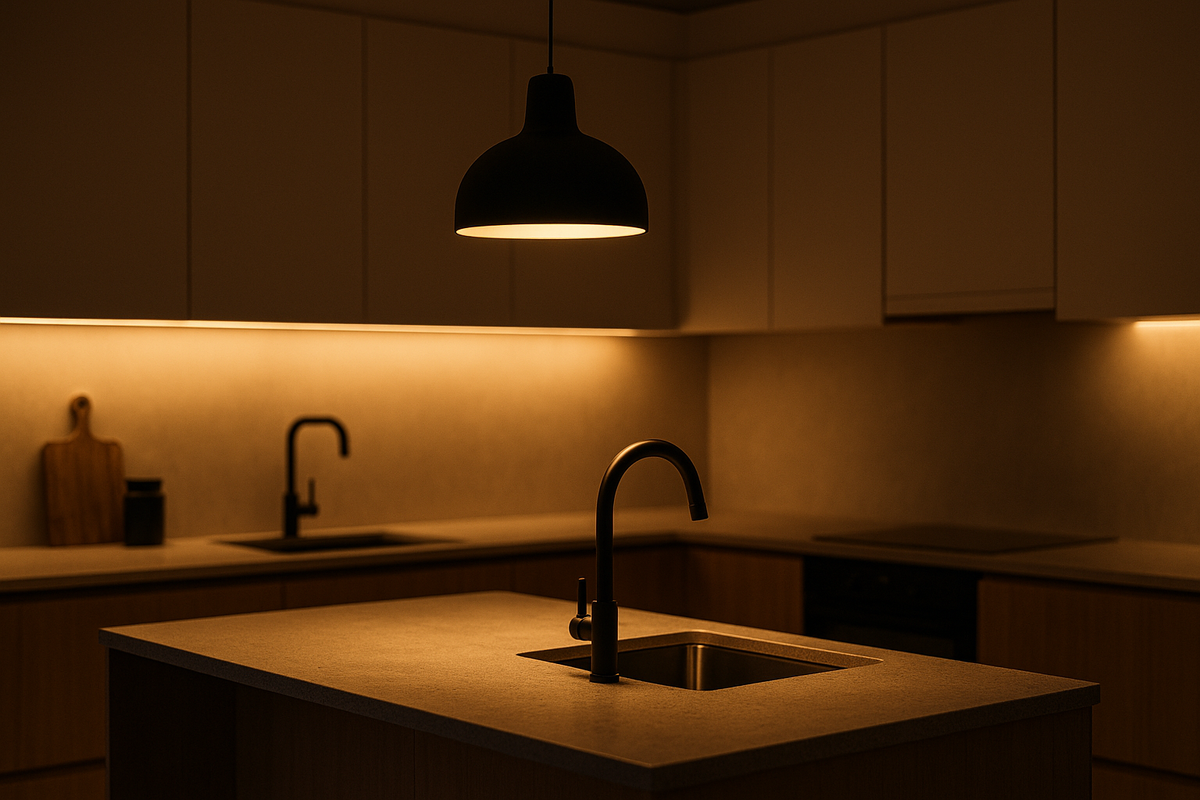 - Под шкафами — профильная лента 3000–3500 K, CRI ≥ 90