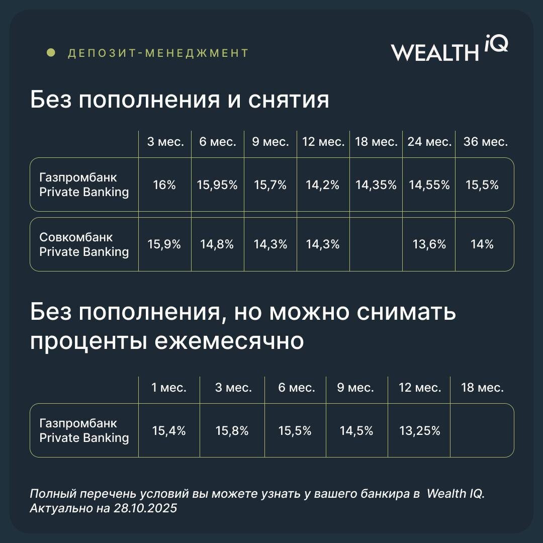 🔄🔄 Какие сейчас ставки по рублевым депозитам? Прошло всего три рабочих дня с тех пор, как ЦБ понизил ставку до 16,5%. Ставки по депозитам в российских банках еще не успели снизиться. Банкир Wealth IQ Ольга Яхош собрала для вас актуальные условия. Что важно знать. Здесь приведены ставки только в четырех банках (они показались нам наиболее привлекательными). В этих и других банках есть и другие вклады — с иными сроками и условиями. Если хотите узнать подробности, обратитесь к своему банкиру в Wealth IQ или свяжитесь с нами — все контакты по ссылке. #депозиты 🏦 @wealth_iqs Дисклеймер
