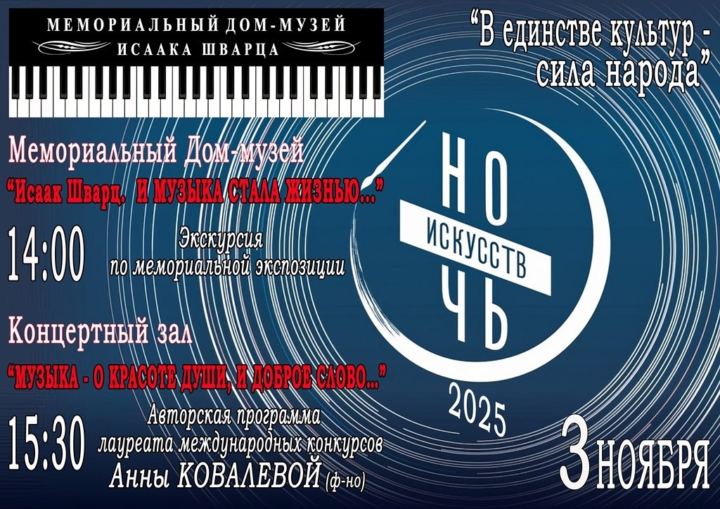 #ДомМузейИсаакаШварца #ночьискусств #ночьискусств2025 3 НОЯБРЯ 2025 года / 15:30 / / НОЧЬ ИСКУССТВ 🎼🎹 / ДЕНЬ НАРОДНОГО ЕДИНСТВА 🇷🇺 / В этот день во всех регионах России в 13-й раз пройдет традиционная ежегодная акция «НОЧЬ ИСКУССТВ». В этом году её мероприятия приурочены ко Дню народного единства и пройдут под девизом «В ЕДИНСТВЕ КУЛЬТУР — СИЛА НАРОДА». Музеи и театры, выставочные и концертные залы, библиотеки и культурные клубы проведут тематические мероприятия в офлайн- и онлайн-формате. Мемориальный Дом-музей Исаака Шварца присоединяется к Всероссийской акции «Ночь искусств» и мы рады представить нашу программу: ✅ В 14:00 ДОМЕ-МУЗЕЕ начнётся экскурсия по мемориальной экспозиции «Исаак Шварц. И МУЗЫКА СТАЛА ЖИЗНЬЮ…», рассказывающая о невероятной судьбе человека, которого Бог одарил талантом слышать высшие мелодии. Также у посетителей будет возможность погрузиться в атмосферу той эпохи, в которой композитору довелось родиться, жить, Показать полностью... Наш канал в Max, вст