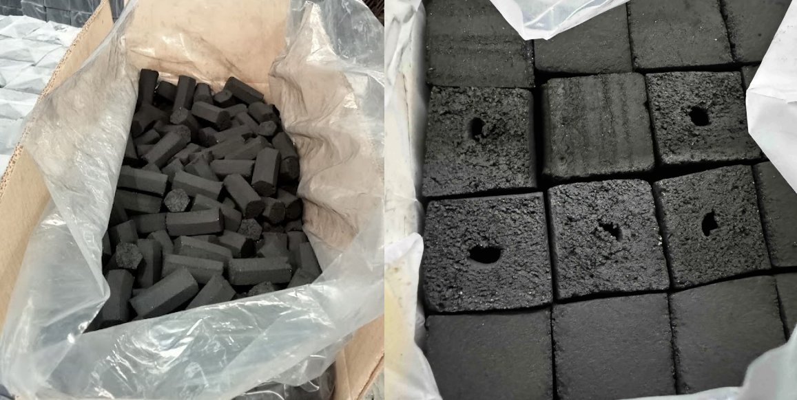 Примерный рецепт кокосового угля: Кокосовая скорлупа – 85%, Тапиока – 5%, Вода - 10%.