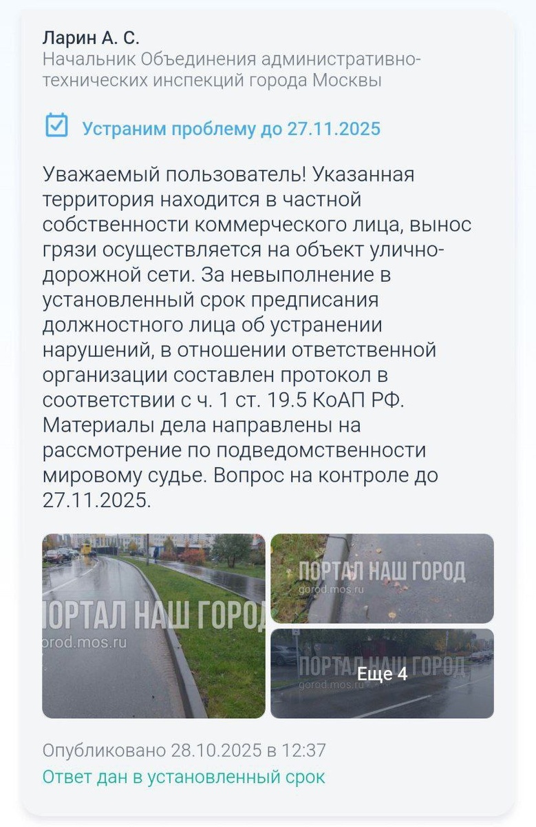 В ответ на пост Застройщика Unikey привлекут к административной ответственности за загрязнение дорог и тротуаров у стройплощадки ЖК "Новые смыслы". Соответствующие материалы Объединение административно-технических инспекций Москвы передало в мировой суд. Протокол составлен по части1 статьи 19.5 КоАП РФ (невыполнение в срок законного предписания органа, осуществляющего государственный надзор) и предполагает штраф от 10 до 20 тысяч рублей для юридических лиц. Небольшой штраф, конечно, но это не повод перестать обращать внимание проверяющих органов на грязь. Пожаловаться на "вынос грязи" можно здесь.
