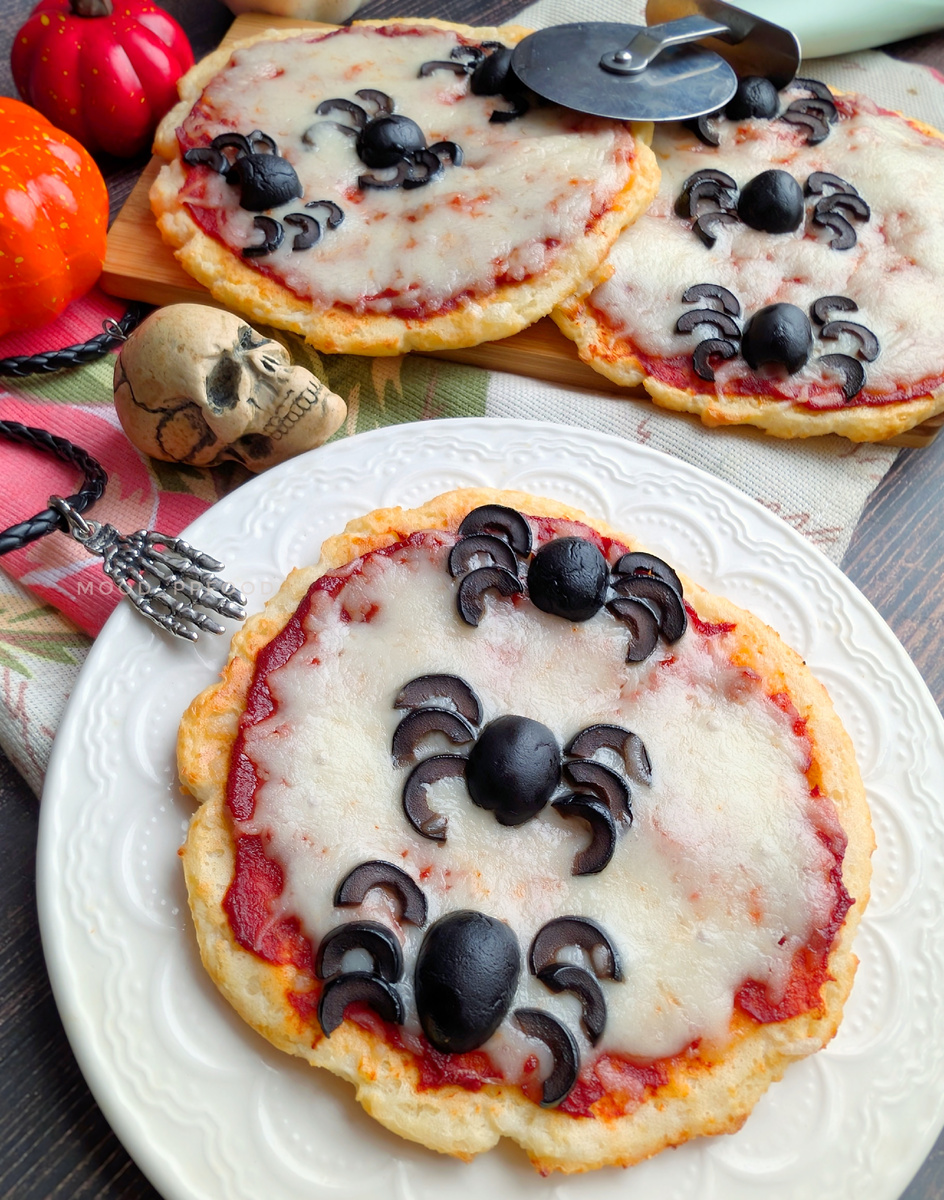 ▫️Для основы: Творог 5% - 180 г. Яйцо куриное - 1 шт. Мука Рисовая - 40 г. Соль - 5 г. ▫️Начинка: Томатная паста - 40 г. Сыр моцарелла - 60 г. Маслины. 1️⃣ Для основы перемешиваем вилочкой: 180 г. творога, одно яйцо, 40 г. муки, чайную ложку соли (5 г.). 2️⃣ Полученое тесто делим на три части, каждую выкладываем на коврик для выпечки и формируем лепешки. 3️⃣ Выпекаем при 180° 20-25 минут до аппетитной корочки. 4️⃣ Займёмся заготовками для паучков. Для этого разрезаем маслину пополам, одну часть откладывая в сторону для "тельца", а другую нарезаем ломтиками, делая "ножки". 5️⃣ На готовую основу выкладываем томатную пасту и распределяем по поверхности, далее посыпаем сыром и выкладываем паучков по желанию в любом количестве. 6️⃣ Снова убираем в духовку минут на 5, чтобы сыр расплавился. Готово, приятного аппетита 😋