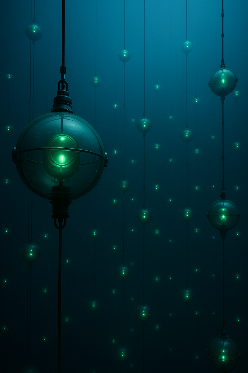 Каждый модуль — это герметичная сфера из стекла, внутри которой установлен фотомножитель, способный улавливать слабейшие вспышки света — черенковское излучение, возникающее, когда нейтрино сталкивается с атомами воды.