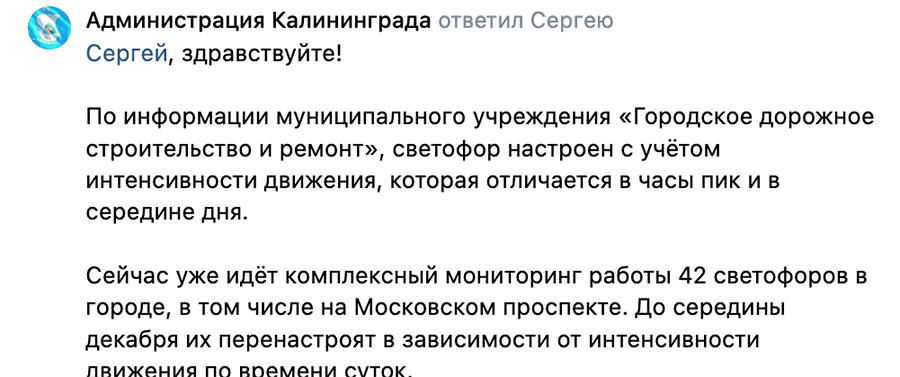 Ответ последовал от представителя администрации Калининграда. «По информации муниципального учреждения „Городское дорожное строительство и ремонт“, светофор настроен с учётом интенсивности движения, которая отличается в часы пик и в середине дня», — говорится в ответном комментарии.