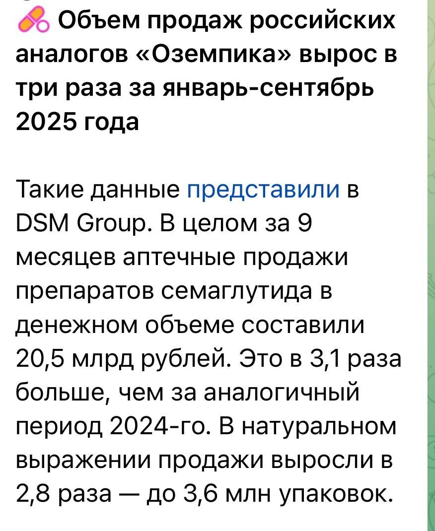 ❗️Вы только представьте 3,6 млн упаковок продано за 9 месяцев на 20,5 млрд рублей! Сколько желающих похудеть, не прилагая никаких усилий🤯 Друзья, помним, что для избыточного веса есть причины и их важно выявить, никакие «волшебные и модные» препараты не помогут, если не убрать причину! Мы знаем, что действие семаглутида проходит, как только прекратится прием препарата и пациент возвращается к прежней жизни и с высокой вероятностью набирает вес еще больше!!!
