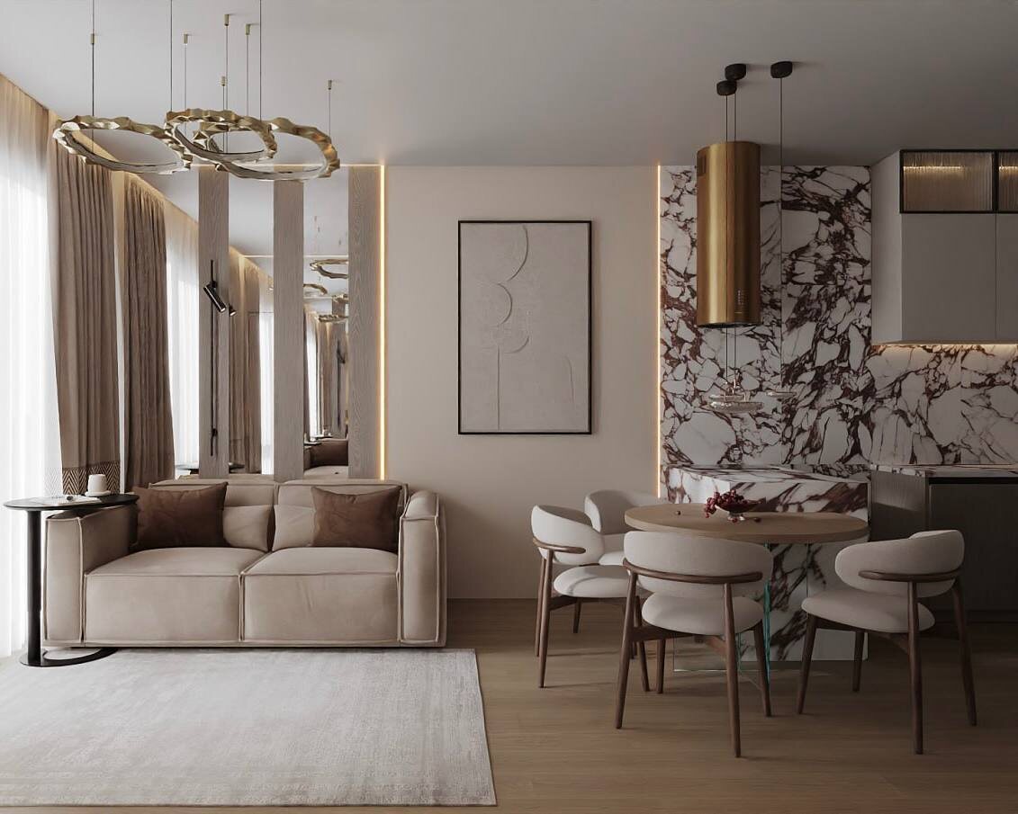✈️ Закулисье визуализаций После того как мы утвердили планировку, команда переходит к визуализации центральной зоны. Первые рендеры всегда смотрит арт-директор, потом — я. Начинается самое интересное: обсуждения, доработки, уточнения. Иногда это мелкие штрихи, а иногда — целые перестановки света, декоративных акцентов, мебели. Когда всей команде кажется, что «всё, попали в точку» — отправляем визуализацию на согласование заказчикам. А теперь угадайте 👀 Какая из этих двух версий ушла заказчице на согласование? И какая, по вашему мнению, выглядит лучше? (приложу оба рендера ниже) P.S. Кухня-гостиная ЖК SAVIN PREMIER 16,7 м2