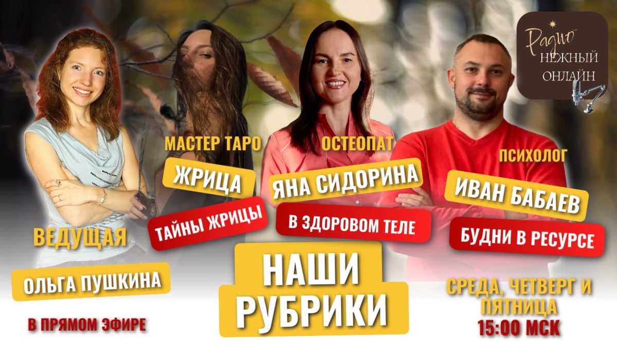 НОВИНКИ радио "Нежный онлайн": регулярные тематические рубрики! 1️⃣ В ЗДОРОВОМ ТЕЛЕ 🏃♀️ в гостях - врачи, натуропрактики и специалисты ЗОЖ Разберём в эфирах: - почему вы болеете; - как жить в здоровом теле без таблеток и диет; - с чем можно обратиться к натуропрактику, а с чем лучше - к врачу и всё, что связано со здоровьем. ⏰ по средам, 15:00 мск ✨✨✨✨✨ 2️⃣ БУДНИ В РЕСУРСЕ ☕️ в гостях - куратор марафонов Татьяны Мужицкой, психолог Иван Бабаев Расскажем в эфирах: - как зарядиться энергией, - как справиться с выгоранием, - как жить и работать с удовольствием каждый день и про всё, что поднимет ваше настроение! ⏰ по четвергам 15:00 мск ✨✨✨✨✨ 3️⃣ ТАЙНЫ✨ЖРИЦЫ в гостях - героиня, чьё имя мы пока не раскрываем, поскольку Жрица - это не личность, а воплощение 2 аркана Таро✨ В эфирах вы получите ответы на вопросы: - почему всё в мире устроено именно так и какие здесь правила; - существуют ли инопланетяне и есть ли с ними контакт; - правда ли, что всем управляет мировое правительс