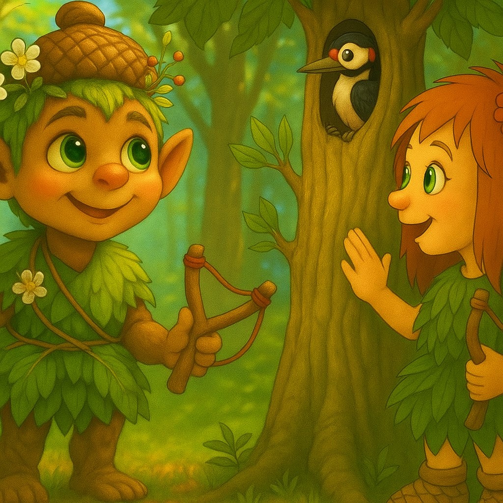 Достал он свою верную рогатку, набрал жёлудей. А Мстикусь, что всегда был рядом с Ярилкой, ловко вскарабкался на ветку. Паучок зашевелил лапками — и вот уже первая шишка полетела вниз.