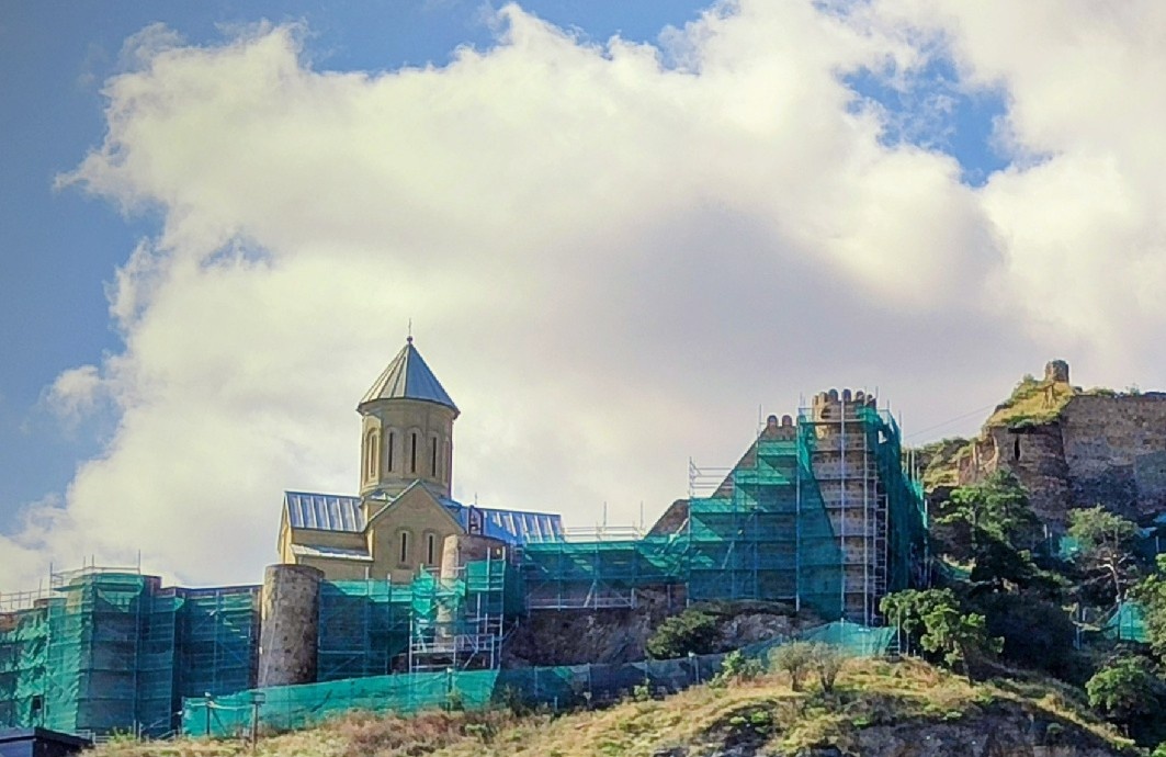 В первой части прогулки прошлись от Сионского собора до дворца царицы Дареджан. Дальше- обратно на правый берег Куры. К крепости Нарикала. Вроде бы далеко. Высоко. Никаких проблем. От дворца царицы Дареджан спустились к парку Рике. Две минуты- и мы у крепости. Как? На канатной дороге. Немножко в очереди, правда, пришлось постоять. Народ, в основном, налево. К крепости Нарикала. Не обращая внимания на то, что она вся в лесах. Ремонт- реставрация. Мы направо. К Матери – Грузии. Скульптуру в 1958 поставили. Деревянную. В 1963 году на алюминиевую заменили. В 1990-е годы еще раз замену провели. Не удержались. Взяли трдельник. В Вене пристрастились. Посидели за чашечкой кофе. Полюбовались на Тбилиси. Все-таки, любимое место фотосессий не только для гостей, но и для жителей грузинской столицы. Вниз пошли пешком. По лестнице Бетлеми. От ног матери Грузии начинается. Пока канатной дороги не было, только по ней сюда и ходили. С 1850 года. По узким старым улочкам. Заставленных непонятно как сюд