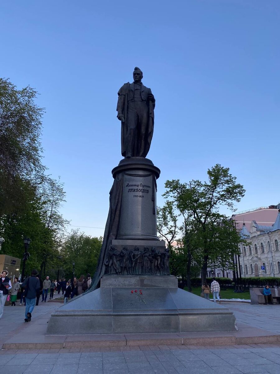 Первым делом наше внимание привлек памятник Александру Сергеевичу Грибоедову, расположившийся прямо возле входа. Его статуя словно наблюдает за всеми прохожими, вселяя чувство уважения к великому русскому писателю.