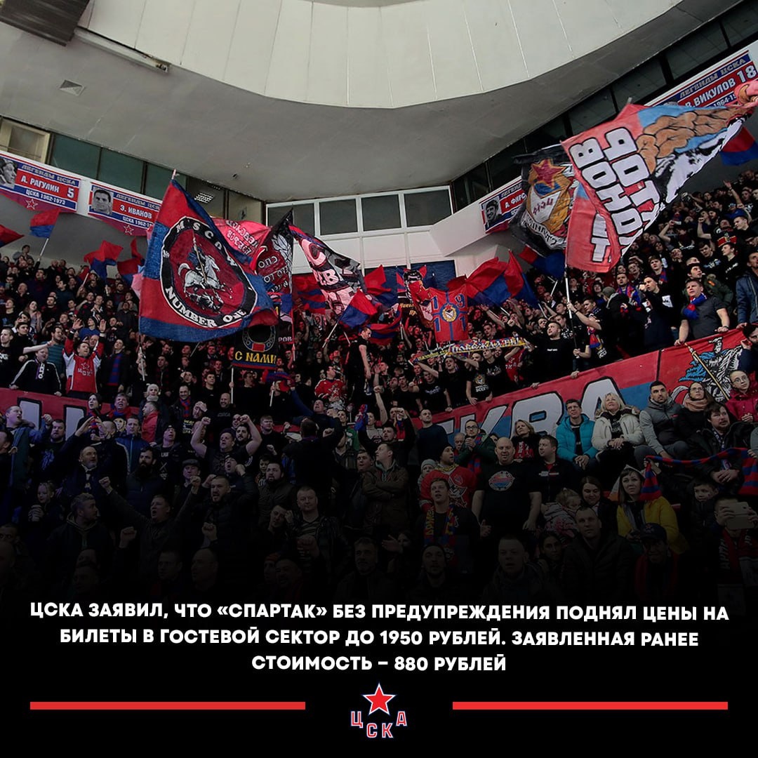 🔥🇷🇺 «Спартак» поднял цены на билеты в гостевой сектор для болельщиков ЦСКА. 🚨 28 октября команды в рамках чемпионата КХЛ сыграют в «Мегаспорте» – на домашней арене красно-белых. «Информация для болельщиков, планирующих посетить гостевой сектор матча «Спартак» – ЦСКА. Сообщаем, что хоккейный клуб «Спартак» в одностороннем порядке и без предупреждения поднял цены на билет до 1950 рублей, при заявленной ранее стоимости в 880 рублей. Просим учесть данную информацию при выкупе билетов на матч. С учетом сложившейся ситуации, в случае отказа от выкупа билетов на гостевой сектор данного матча, правило отмены заявки на последующие игры временно не действует. Вы сможете приобрести билеты на следующие выездные матчи», – говорится в сообщении ЦСКА.