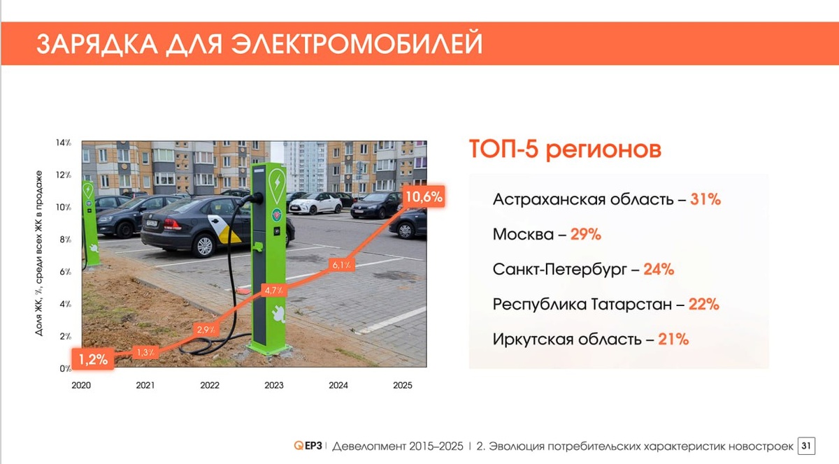 Количество таких ЖК с зарядками для электрокаров выросло за 5 лет почти в 9 раз — слайд из презентации ЕРЗ.PФ с форума 100+ TechnoBuild Из важных потребителю инноваций в ЖК нашли только наличие зарядки для электромобилей. Странно, казалось бы — где безопасность, видеонаблюдение и умный дом?