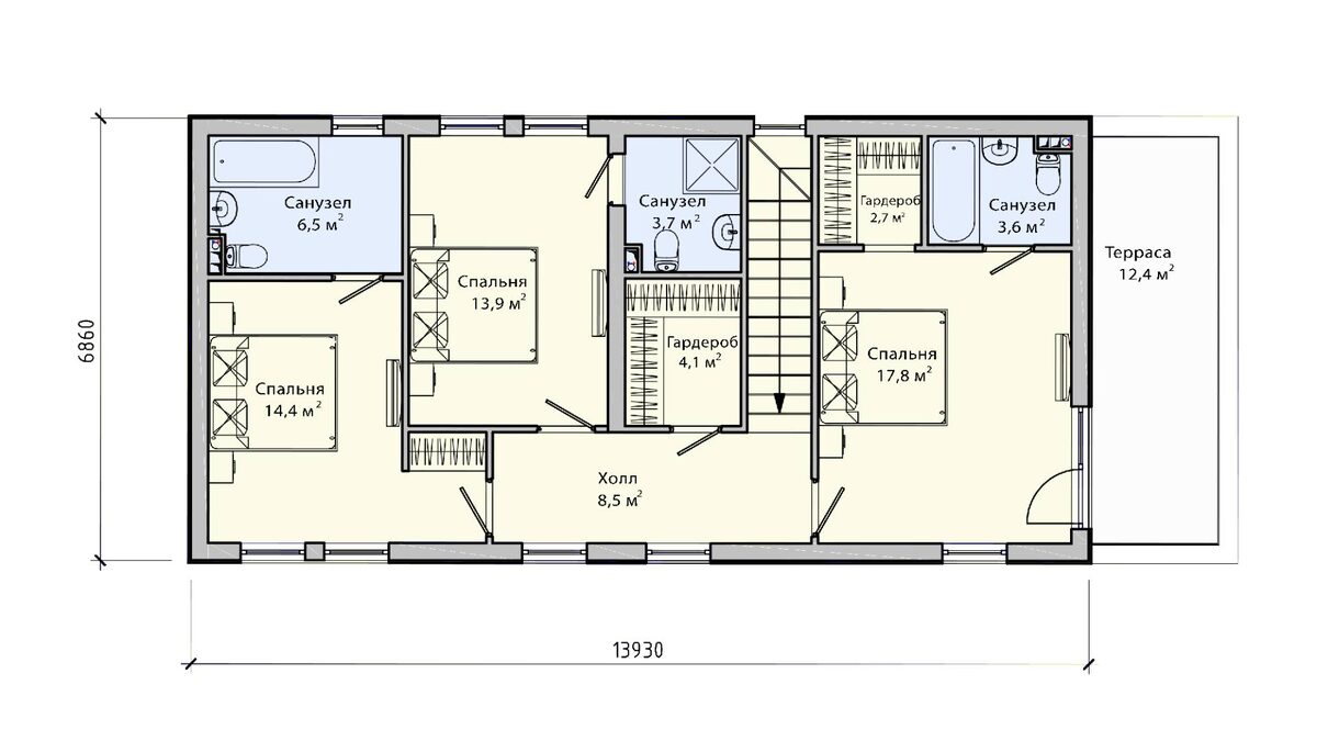 Проект ПБ-154 — современный двухэтажный коттедж размером 7 на 16 метров с 3 спальнями и общей площадью 157,3 м²