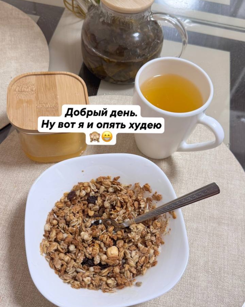 Завтрак у меня был — мюсли с травяным чаем. Я еще мед в них ложу, для энергии и настроения. На обед овощное рагу. А на ужин... о, тут самое интересное! На ужин у нас фруктовый салат с йогуртом.