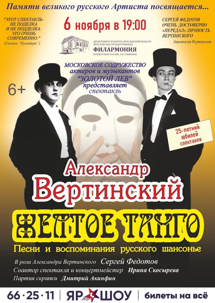 📢 6 ноября 2025 г. всех ждем на «Желтое танго» Александр Вертинский 👀 - захватывающий двухчасовой спектакль, которому в этом году исполнилось 25 ЛЕТ ✨.