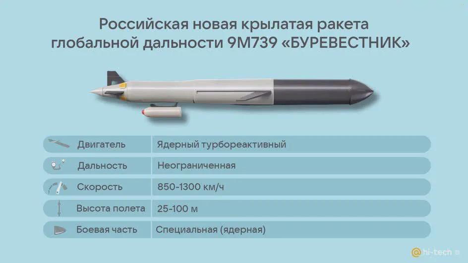 Рубрика #пояснительнаябригада Вопрос подписчика: Владимир, интересно Ваше мнение по поводу полёта Буревестника. Что это было? Ведь если всё так, как заявляет российская сторона, мы имеем дело с технологическим прорывом невероятного масштаба, открывающим фантастические перспективы для России. Меж тем, новость прошла без особого фурора, как так-то? По Буревестнику, похоже ракета действительно полетела, по крайней мере мы имеем подтверждение от Норвегии (подтвердили что наблюдали полет). Принцип работы ядерной двигательной установки: Атмосферный воздух разогревается ядерным реактором и выбрасывается создавая реактивную тягу. Топливо двигателя не выбрасывается с реактивной струей как у химического двигателя, а только выделяет энергию, выбрасывается только рабочее тело в качестве которого выступает воздух и запас которого пока на планете не ограничен. Т.е. теоретически полет может продолжаться пока реактор выделяет достаточное количество энергии (дни, недели). Что это дает: Прежде всего ту