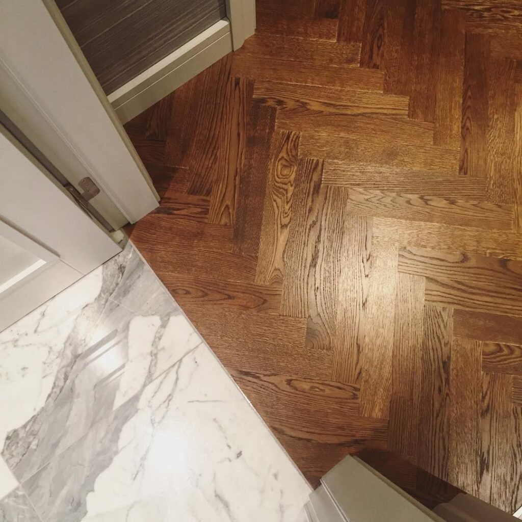 - Влажностное расширение древесины. Паркет — «живой» материал, он изменяет размеры при колебаниях влажности, в отличие от керамики или бетона. Поэтому важно оставлять технологические зазоры и использовать стабильные породы (например, дуб или орех).