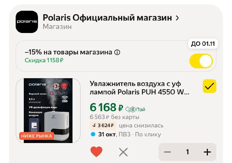 Увлажнитель воздуха с уф лампой Polaris PUH 4550 WIFI IQ Home Отличная цена!!! Везде стоит около 10К необходимо подписаться на магазин и в корзине зажать бегунок Ссылка: https://market.yandex.ru/cc/7tGwPV Актуально на момент публикации Подписаться на канал: https://dzen.ru/id/65f30992106fab2943124639 #покупки #отзывы #экономия #скидки #распродажа #промокоды