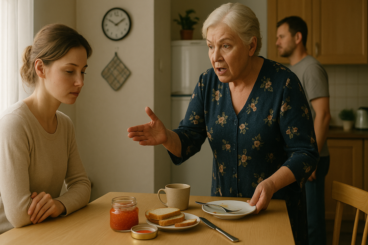 Клавдия Петровна кивнула, села за стол. Взгляд свекрови скользнул по столу и остановился на открытой банке икры. Лицо Клавдии Петровны вытянулось, брови поползли вверх.