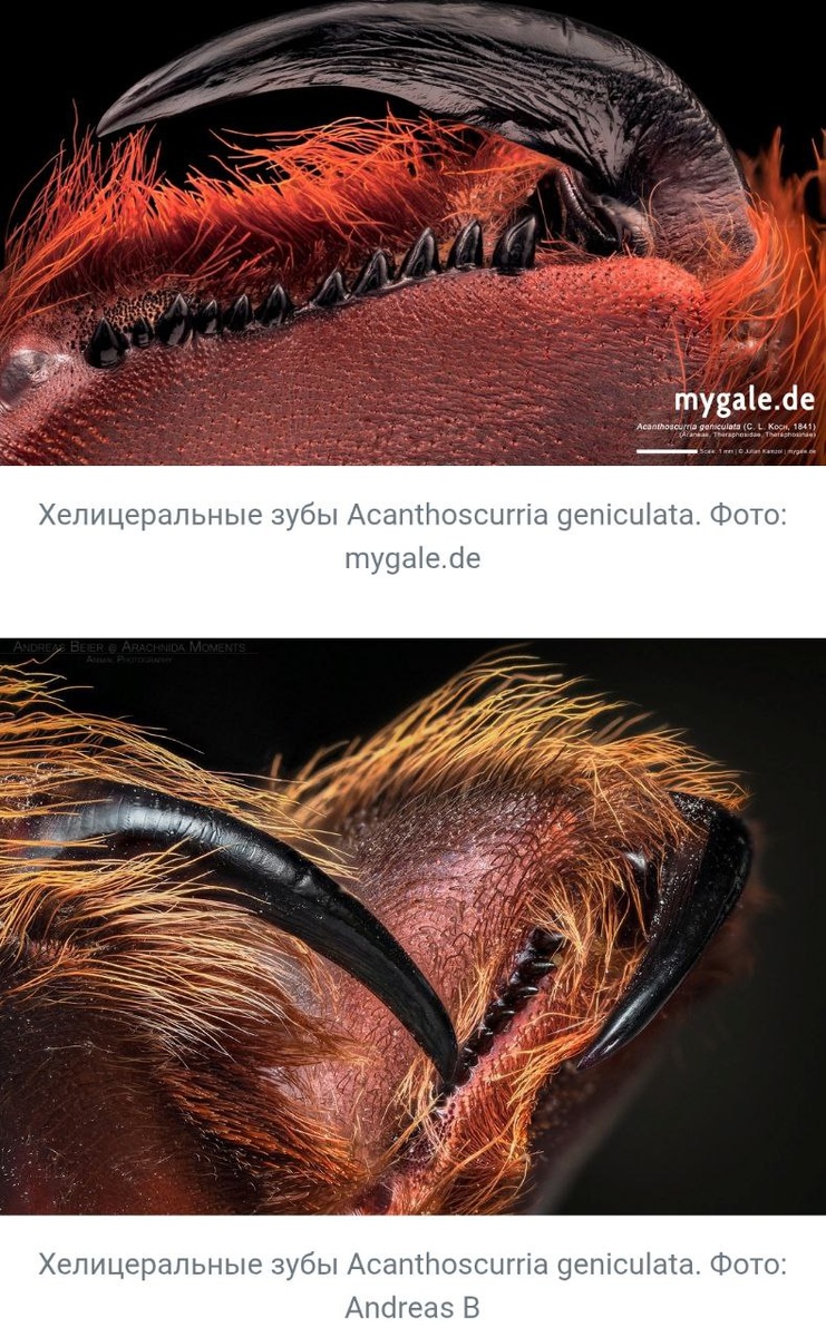 Птицееды Ну и главным моим открытием сегодня были... зубы пауков! Да-да!! У моих любимых пушистиков имеются не только хелицеры с протоками для яда, но и настоящие зубки, которые помогают заминать хитин добычи, формировать комочек "мусора" после трапезы из остатков еды. Обязательно попробую сфотографировать их на следующей шкурке после линьки, а сейчас - фотогафия из классной статьи: на ней вид паука, который живёт и у нас.