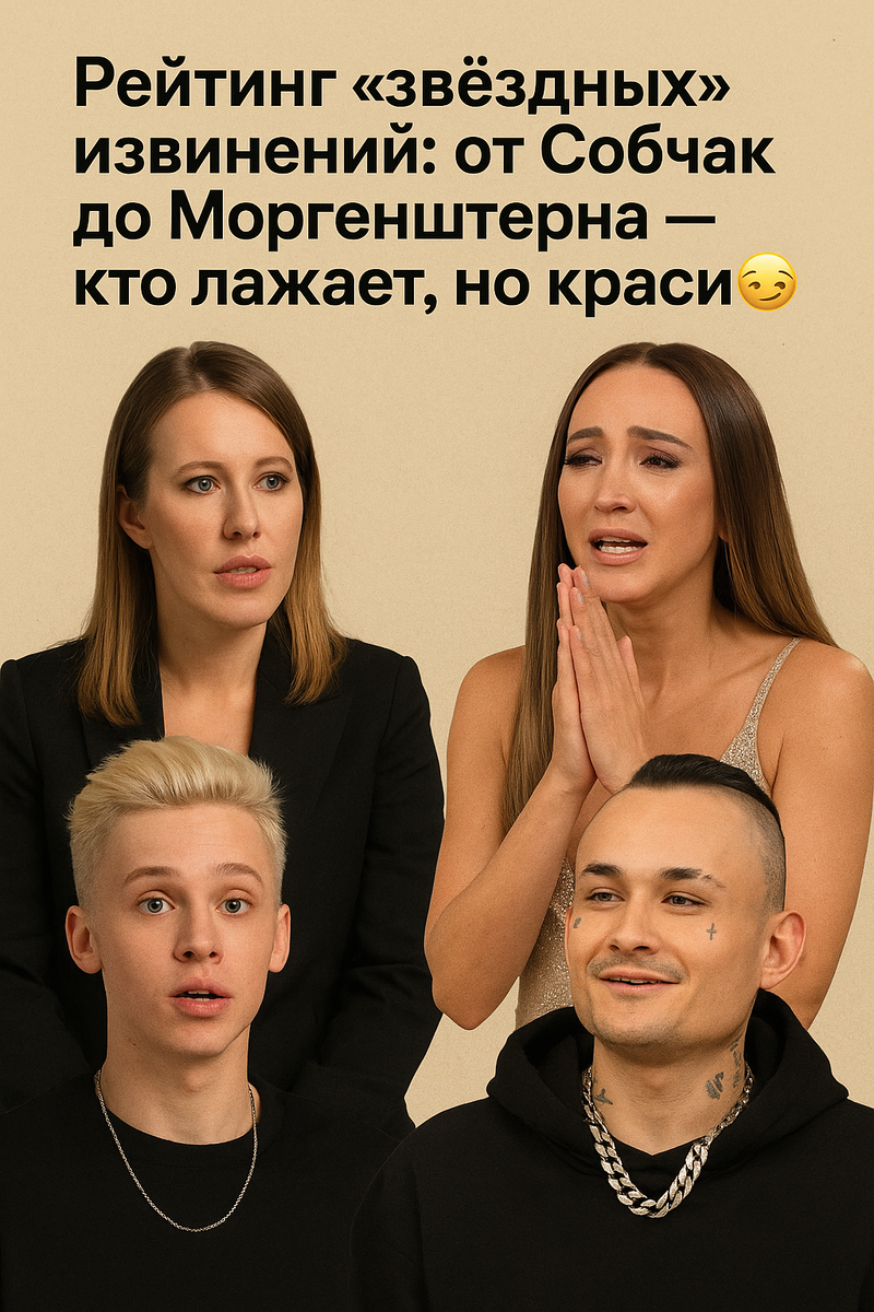Иногда кажется, что у наших звёзд есть отдельный диплом — по искусству извинений. Причём не простых, а эффектных, с софитами, оператором и хэштегом #проститеменя. Ну правда — если уж лажать, то красиво! И ведь кто-то делает это с таким вкусом, что даже начинаешь сомневаться: а не специально ли всё это шоу?.. Место пятое — Ксения Собчак.