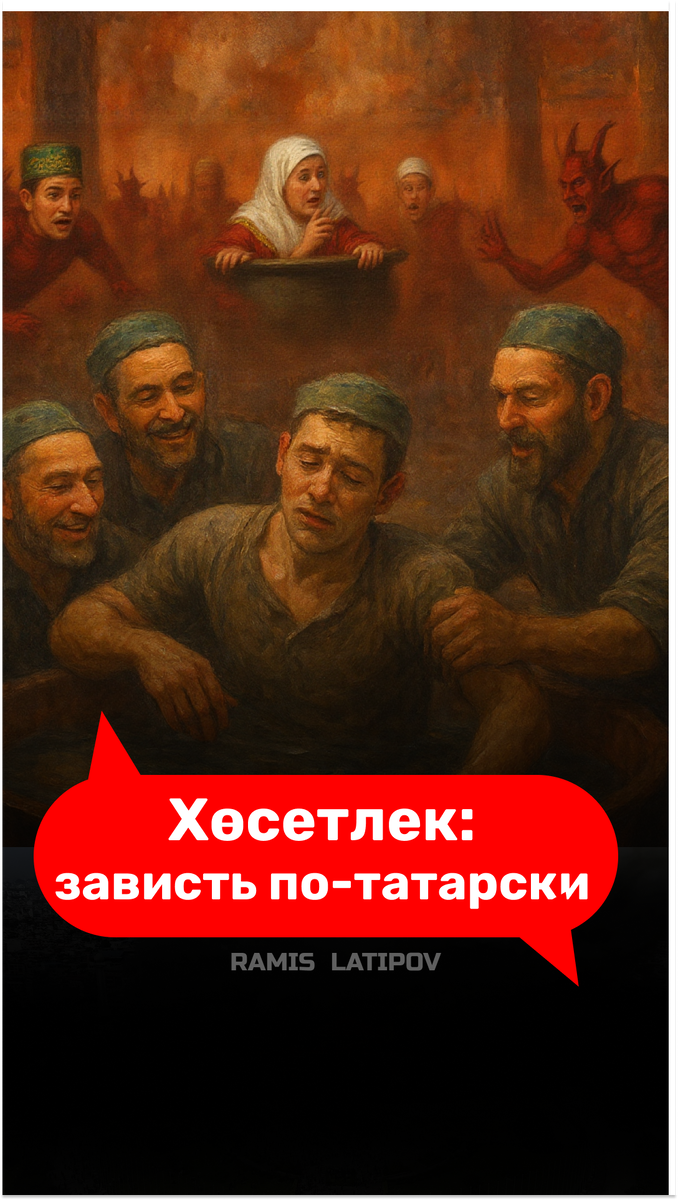 Когда говорят о качествах татар, обычно вспоминают трудолюбие, терпение, скромность. Но редко обходятся без ещё одного – зависти, көнләшү, хөсетлек. Есть старый анекдот. В аду комиссия пришла – проверяет, как грешников варят в котлах. Котёл – это Казан. У каждой нации свой котёл, вокруг черти-охранники. Кто-то пытается вылезти – его обратно сталкивают. Только возле одного котла никого нет. Комиссия удивляется: – А почему тут без охраны? – А это татары, – отвечает администратор. – Если кто-то вылезать начнёт, остальные сами за ноги обратно утянут. Вот так и живём – в Казани, в большом котле. Зависть – это көнләшү, она есть у всех. А у нас есть и хөсетлек – ревность высшей пробы, злодеяние от зависти: «Если мне не досталось, пусть и другому не будет». Есть притча. Всевышний спрашивает у одного человека: – Попроси, что хочешь, но соседу дам вдвое больше. И тот попросил: – Ослепи меня на один глаз. Хөсетлек не раз ставил подножку в нашей истории. Из-за него рушились союзы, начинались ссор
