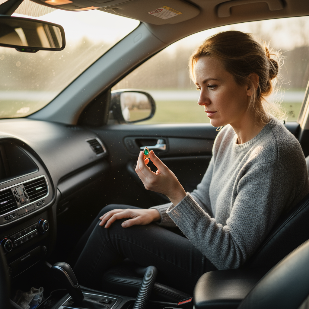 Начала с заднего сиденья: вытащила старые газеты, бутылку воды, какие-то документы. Потом пылесосом прошлась под сиденьями, в щелях, между креслами. И вот, когда она водила щёткой под пассажирским сиденьем, пылесос что-то засосал с металлическим звоном. Ольга выключила его, наклонилась и заглянула в прозрачный контейнер.