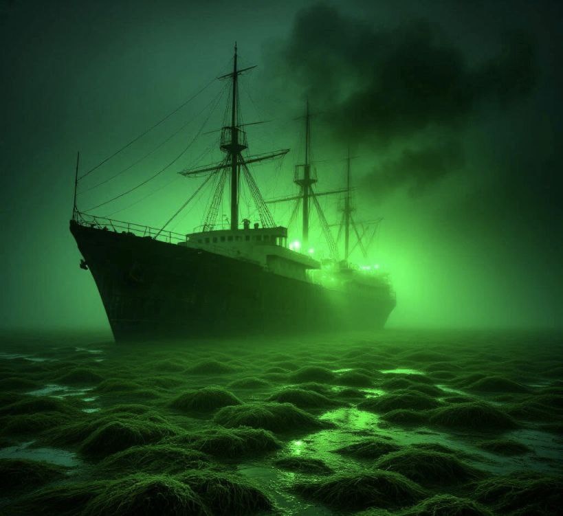 Через пару часов такого кошмара непогода стала утихать. Была ночь, поверхности воды почти не было видно. Мы оценивали ущерб и пытались реанимировать корабль, связаться с землей, но все было безуспешно. Когда начало светать, мы не могли поверить своим глазам: штормом нас унесло в зловещие воды Саргассова моря.. Так начался наш многодневный дрейф в водах этого ужасного моря. Повсюду зелено-бурые водоросли, которые словно щупальцами трогали корабль со всех сторон. Гладили его, будто мертвецы, пытающиеся дотянуться до живых своими холодными руками. Порой морской глади не было видно совсем - вся она была затянута водорослями. И выйти из этих зарослей не представлялось возможным - ничего не работало. Механики днями и ночами пытались починить приборы, хотя бы восстановить связь, но все без толку.