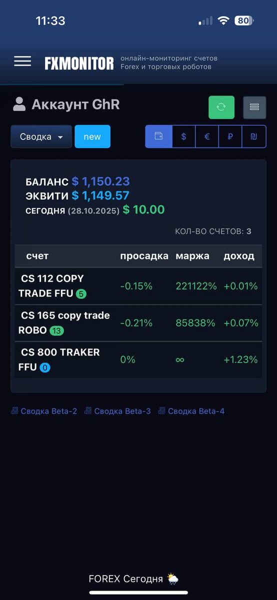 🌟 Мониторинг моего торгового аккаунта: итоги на 28.10.2025 🌟 Друзья, делюсь результатами мониторинга своего аккаунта на платформе FXMONITOR! 📈 💼 Основные показатели: Баланс: $1,150.23 — держу курс! Эквити: $1,149.57 — практически совпадает с балансом, что говорит о стабильности. Доход за сегодня (28.10.2025): +$10.00 — небольшой, но приятный прирост! 🎉 Количество счетов: 3 — удобно контролировать. 📊 Разбивка по счетам: CS 112 COPY TRADE FFU (5): Просадка: –0.15% — минимальная, почти незаметная. Маржа: 221 122% — впечатляющий показатель! Доход: +0.01% — небольшой, но стабильный рост. CS 165 copy trade ROBO (13): Просадка: –0.21% — чуть больше, чем на первом счёте, но всё ещё в пределах нормы. Маржа: 85 838% — тоже впечатляет! Доход: +0.07% — заметный прирост по сравнению с первым счётом. CS 800 TRAKER FFU (0): Просадка: 0% — идеально! Никаких потерь. Доход: +1.23% — самый высокий показатель среди всех счетов! 🚀 💡 Вывод: день прошёл успешно — все счета показали либо стабильность,