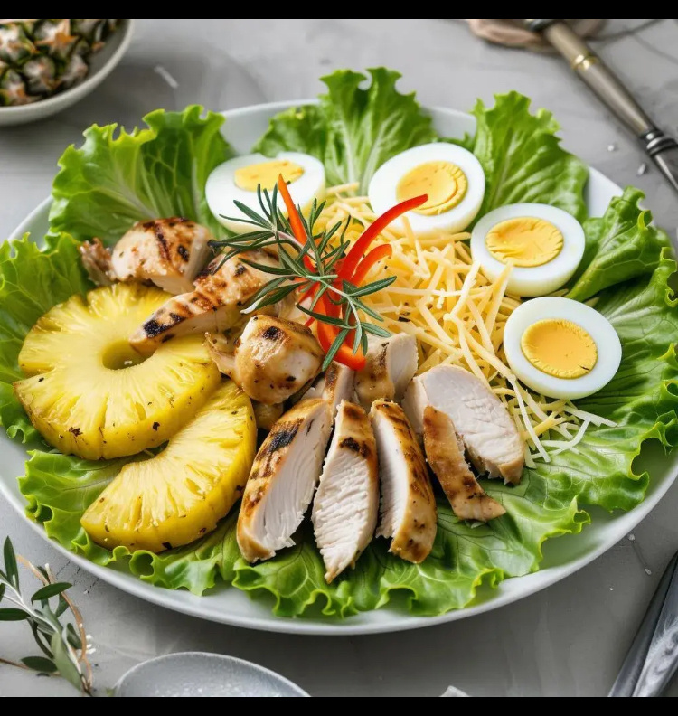 Приготовьте вкусный и оригинальный салат, который станет украшением любого застолья. Этот яркий салат сочетает нежность ананасов, аромат курицы и пикантность сыра. Готовится быстро и легко! Ингредиенты: Консервированные ананасы кольцами — 300 г Куриное филе отварное — 300 г Сыр твердый (Российский, Гауда) — 150 г Яйца вареные — 3 шт. Майонез — по вкусу Зелень свежая (укроп, петрушка) — небольшой пучок Способ приготовления: Подготовка ингредиентов Отварите куриное филе до готовности, остудите и порежьте кубиками среднего размера. Разделите консервированные кольца ананаса на кусочки. Твердый сыр натрите на крупной терке. Вареные яйца очистите от скорлупы и измельчите ножом либо пропустите через яйцерезку. Сборка салата Смешайте нарезанное куриное мясо, порезанные ананасы, сыр и яйца в глубокой миске. Добавьте немного майонеза, аккуратно перемешивая ингредиенты, чтобы салат выглядел воздушным и легким. Финальный штрих Украсьте блюдо свежей зеленью перед подачей на стол. Дл