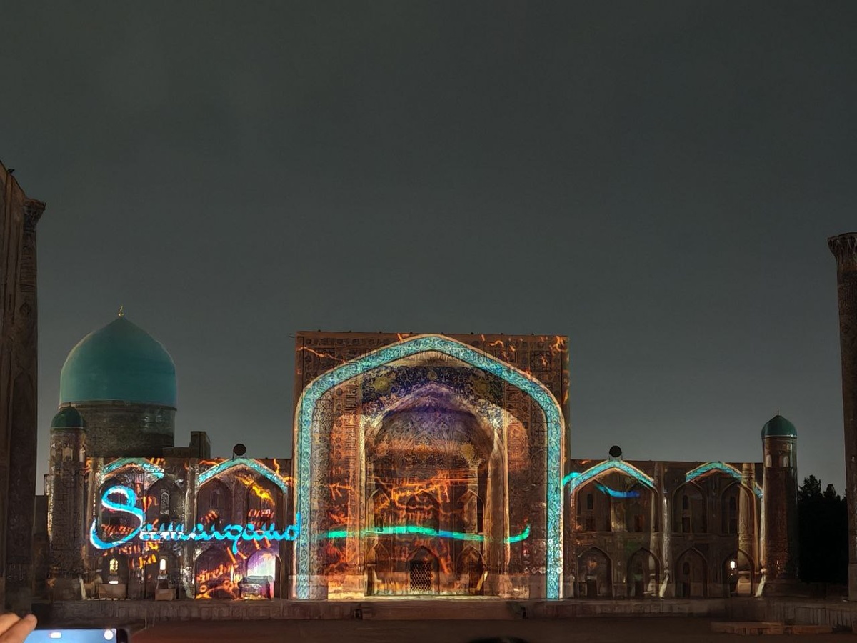 Регистан - самое известное место не только в Самарканде, но и во всем Узбекистане. Не ошибусь, если скажу, что здесь побывало, практически 100% приезжающих туристов. В Центральной/Средней Азии главные площади городов традиционно назывались Регистан, что означает «песчаное место». Регистан Самарканда - великолепный архитектурный ансамбль ХV века, который включает в себя три медресе (Улугбека, Тилла-кари и Шердор). Но не все знают, что Регистан прекрасен не только днём, но и вечером. По вечерам фасады медресе Улугбека, медресе Тилля-Кари и медресе Шердор превращаются в экраны для светомузыкального шоу, рассказывающего об истории Узбекистана. Свето-музыкальное шоу (почему-то здесь его называют лазерное) проходит в двух вариантах. В 20:00 музыкально-световое шоу без голосового сопровождения, продолжительностью 20–25 минут, а после в 21.00 — лазерное шоу с рассказом об истории и достижениях Узбекистана: от древних цивилизаций и караванов Шелкового пути до звездных карт Улугбека и поэ