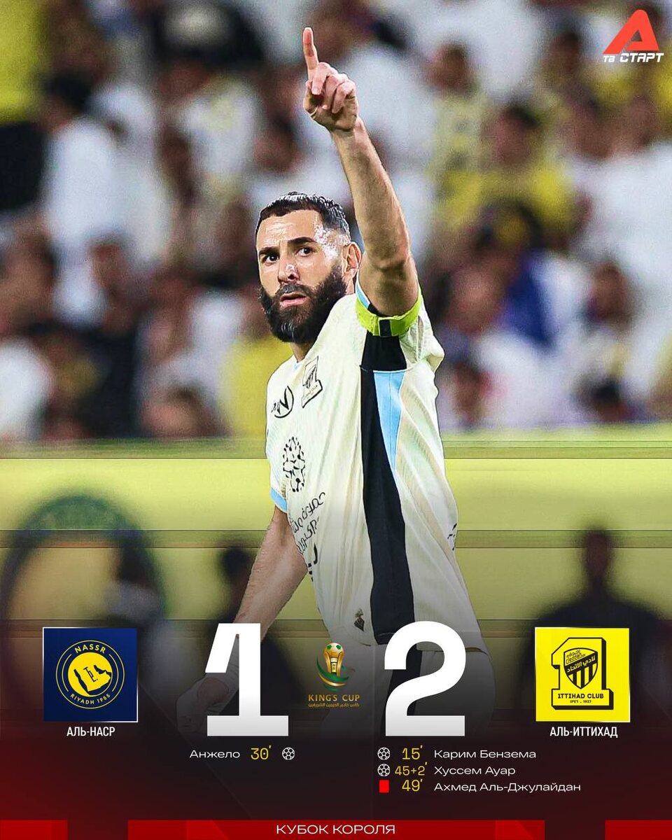 🏆❌Минус трофей для Криша. Роналду покидает Кубок Короля «Аль-Наср» практически целый тайм играл в большинстве, но так и не смог камбэкнуть против «Аль-Иттихада» Карима Бензема🙅🏻♂️ Пора Роналду бросить все свои силы на АЛЧ-2 — там есть неплохие шансы на победу😅 Подписывайся на ТВ СТАРТ в MAX📲