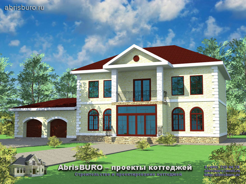 Готовый проект коттеджа К329-309 с камином, балконом и гаражом на две машины общей площадью 309 квадратных метров в архитектурном бюро AbrisBURO. Проектирование загородных домов и коттеджей, архитектурные и конструкторские решения домов.