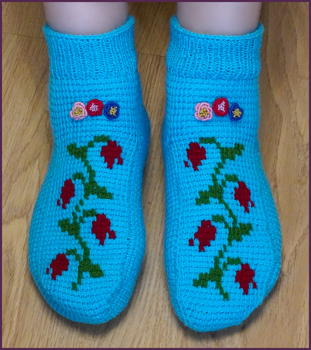 Носки связаны прямым и круговым тунисским крючком 3,0 мм. Манжеты носков связаны спицами 2,5 мм. В оформлении носков использовала технику жаккарда. Дополнительно украсила вышитыми цветочками. Пряжу использовала BONBON Kristal, 100% акрил, в 100 граммах 475 метров. Цветочки вышивала нитками мулине. Внутри цветочков использовала пряжу YarnArt CAMELLIA, 70% полиэстер, 30% металлик, в 20 граммах 190 метров. Ссылка указана ниже: https://rutube.ru/video/ddf8d77dc38e2cb6a370a5b2e54d9a03