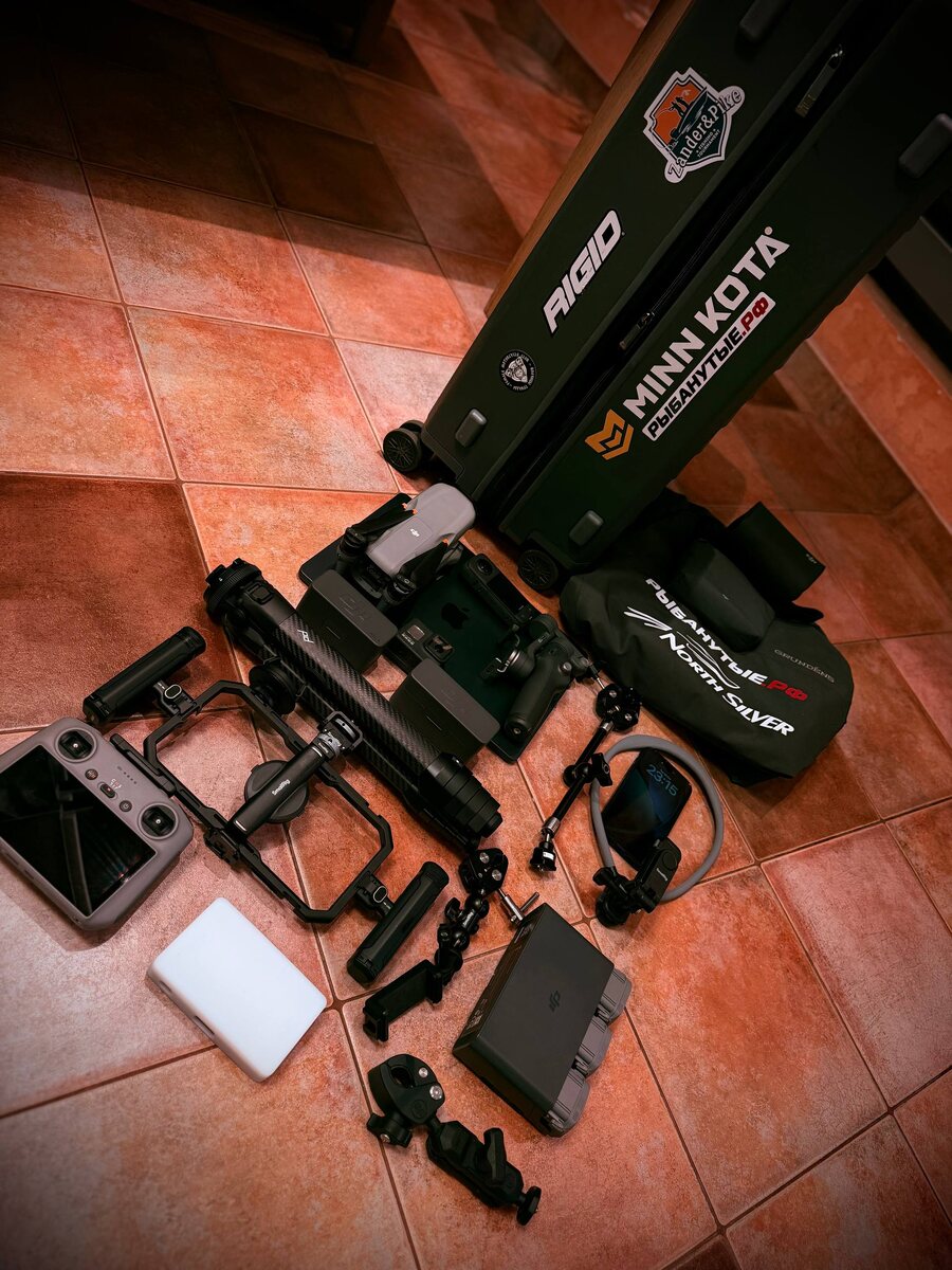 Всё как обычно — чемодан, техника, камеры, дрон, микрофоны и целая гора съемочного оборудования