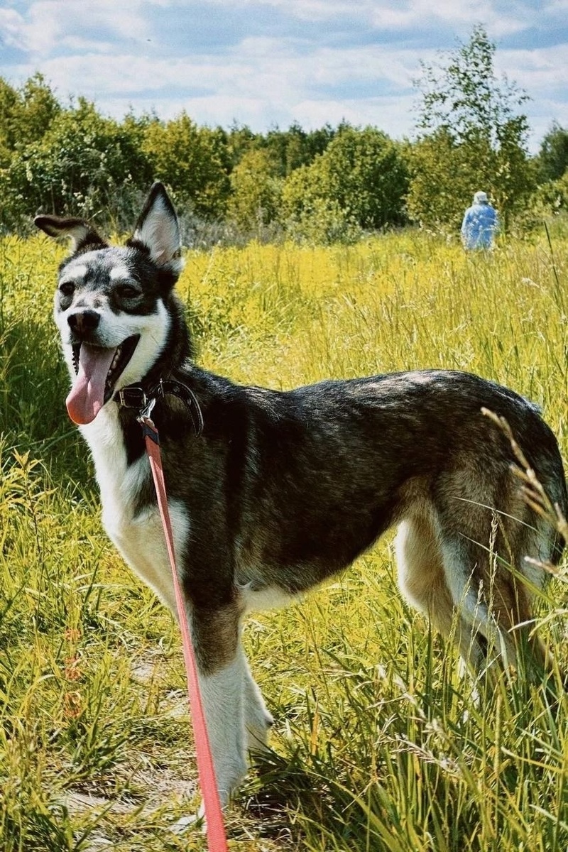 По поведению можно сказать - это спокойная собака, поводок сильно не тянет. Может немного испугаться чего- то надуманного на пути и остановиться в нерешительности ... А может наоборот-она в душе охотник и замирает, чтобы прислушаться и удостовериться, что всё хорошо и можно без опаски продолжать путь.....Боится дороги, поэтому волонтеры гуляют с ней лесными тропами. И этот барьер также преодолим, стоит только заняться ею вплотную.