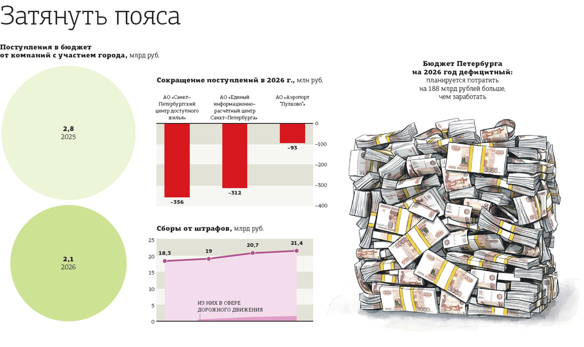 Город фиксирует сокращение неналоговых доходов бюджета, в 2026–м по этой статье ожидается поступление 83 млрд рублей (в 2027–м — 75 млрд). В текущем году — с учётом последних корректировок — должно поступить 107 млрд (–22%). В 2024–м, например, совокупно поступления по этой статье (штрафы, арендные платежи, выручка от продажи имущества и т. д.) у Петербурга составили 127,8 млрд.