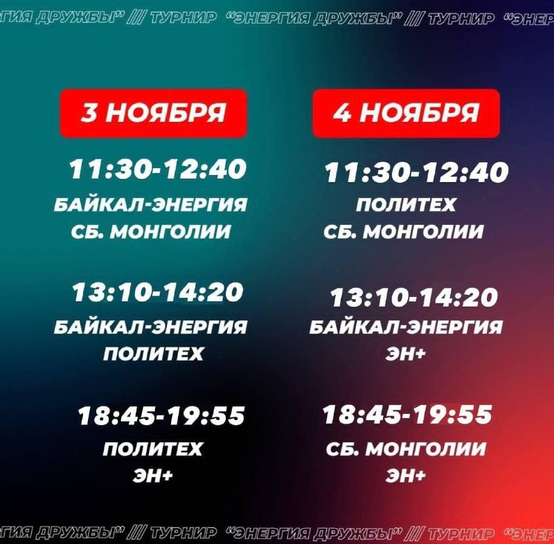 Приглашаем на турнир «Энергия Дружбы» 3-4 ноября состоится захватывающее событие — турнир «Энергия Дружбы», в котором хоккей с мячом соединяет сердца двух народов! 🇷🇺🤝🇲🇳 В этом турнире примут участие 4 команды: • Байкал-Энергия • Сборная Монголии • Иркутский Политех • Команда ЭН+ Предстоящие матчи обещают быть яркими и полными эмоций! Вход на матчи бесплатный! Приходите поддержать хк «Иркутский политех» в ЛД «Байкал».
