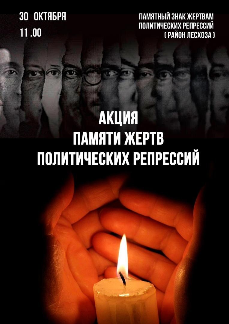 30 октября — День памяти жертв политических репрессий Завтра, 30 октября, в 11.00 у мемориала в районе лесхоза пройдет акция памяти жертв политических репрессий. Все желающие смогут почтить память пострадавших от гонений, осужденных по политическим статьям, сосланных или расстрелянных в Минусинске.